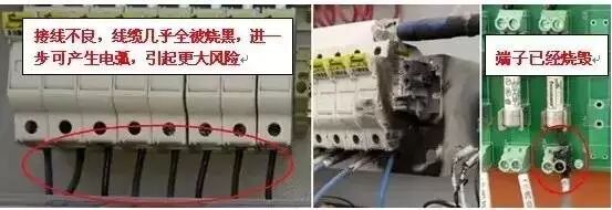 | 图4 组串式光伏组件故障时的电流流向 3 熔丝在光伏应用中存在的问题 笔者走访了大量电站,发现熔丝在每个电站都存在一些问题,本文主要从熔丝的安全风险和熔丝失效造成的损失等方面进行分析。 3.1 熔丝增加了直流节点,埋下安全隐患 集中式1MW需要使用熔丝400个,每个熔丝与熔丝盒夹片之间有2个接触点,每个熔丝盒与接线有2个接触点。所以每个熔丝将有4个接触点,集中式因使用了熔丝就有1600个直流节点。熔丝盒对线缆可靠安装要求高,现场实际不容易做到,经常出现接触不良的现象,引起烧毁或者直流拉弧,是汇流箱着火的主要原因。 图5 直流汇流箱着火 图6 熔丝接线不良引发的烧毁着火案例 图7 熔丝与底座接触不良 图8 熔丝安装质量堪忧,一段时间后肯定会发热烧毁 3.2 熔丝在低倍过载时,熔断慢,发热高,存在着火风险 |