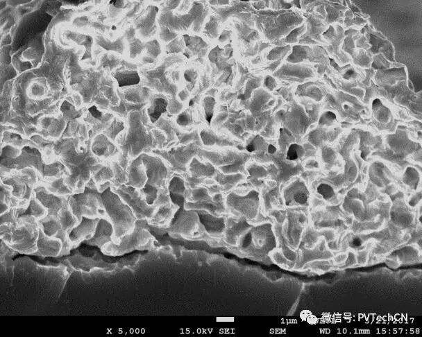 相比单晶电池,常规多晶电池的表面反射率高3%~5%(绝对值)。多晶电池效率的提升受制于表面反射率的降低。降低表面反射率是提高多晶电池效率的关键。从成本方面考虑,单晶硅片受益于金刚线切割工艺的推广,成本大幅下降;而多晶硅片金刚线线切的推广受制于电池制绒工艺的匹配。具体而言,金刚线切割多晶硅片在使用常规酸制绒工艺后,会导致电池效率降低;而黑硅制绒可以很大幅度上解决金刚线切割带来了制绒工艺上的困难。黑硅可以分为两大类,第一个是用干法,用得最多的是等离子刻蚀(RIE),同时还有一些激光技术。第二类是湿法刻蚀(MCCE),就是用贵金属催化来做化学腐蚀。 另外,有别于湿法刻蚀技术,目前也有厂商基于传统酸制绒设备工艺,使用化学添加剂,从而以较低成本实现对金刚线切割多晶硅的制绒,本文在此不作详细介绍。 图一, 干法制绒的绒面结构电镜扫描图片 图二,湿法制绒绒面结构电镜扫描图片 由于不同类型的的黑硅绒面结构的不同,正银浆料在不同黑硅绒面上的表现也不相同。干法黑硅和普通多晶相比,对浆料的要求区别不大。湿法黑硅相比正常多晶绒面,使用普通正银的主栅焊接拉力可能丢失大于50%,更严重的情况下,细栅的附着力也会受到影响甚至脱落。 因此,拉力高的产品在湿法黑硅上可能有明显得优势。Heraeus 新一代为黑硅制绒定制的SOL9641A系列正银产品成功的克服了这个难题。该新一代浆料具有非常高的拉脱力,大于2N/mm。 图三, 细栅脱落的电镜扫描图片 图四, 细栅截面的电镜扫描图片 对接触电阻来讲,由于黑硅制绒表面的纳米结构,丢失了部分物理接触面积,从而接触电阻会比常规多晶高。在MCCE 多晶硅片上比起普通多晶容易产生EL黑云和黑斑。 图五,普通多晶EL 图六,MCCE wafer EL黑云和黑斑 而且正银浆料中使用的不同的玻璃粉在高温熔化状态下可能不同,从而在黑硅绒面上接触可能会表现出不同。因此,针对黑硅绒面,我们需要对浆料关键组分和配方进行系统的定制。 Heraeus 新一代FS 41-1215 和9641A为黑硅定制的SOL9641A于普通浆料相比。新一代浆料平衡了接触和开压,使得接触和开压都得到了提升,在细线印刷上也取得了长足的进步。下表是SOL9641A在客户对比测试中表现出的优异结果。 |