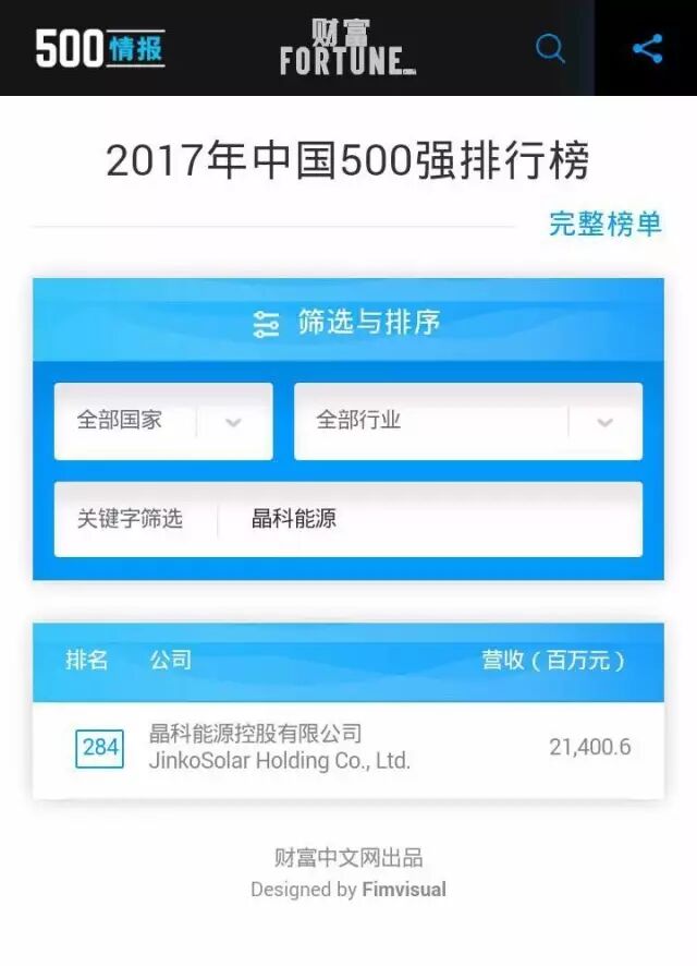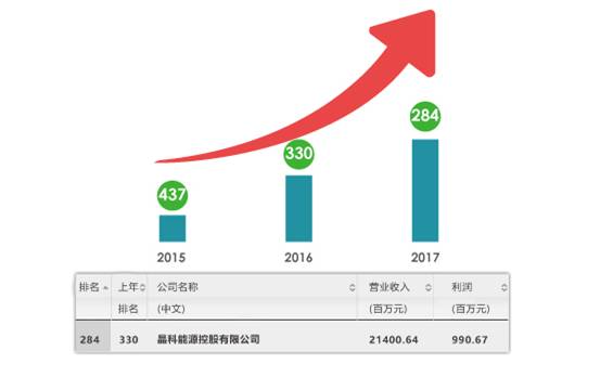 7月31日,财富中文网发布了最新的《财富》中国500强排行榜,该榜单由《财富》(中文版)与中金公司财富管理部合作编制,考量了全球范围内最大的中国上市企业在过去一年的业绩和成就。晶科能源位列榜单底284名,又创新高。 晶科能源在“财富中国500强”榜单中屡创不菲佳绩: 2015年 晶科能源强势回归,以2014年近100亿元的营业收入,成为榜单上的“新面孔”,居“财富中国500强”437位。 2016年 晶科能源再接再厉,以2015年160.8亿人民币的营收,跃升至2016《财富》中国500强第330名,名次较上一年飙升107名。 2017年 晶科能源又创新高,以2016年超过214亿人民币的营收,晋级中国500强的第284名,于稳定中快速发展。 晶科能源的稳健增长来源于对领先技术的不断探索,晶科始终专注于开发高效产品,从而提升竞争优势。晶科的技术团队也一直在努力优化单晶和多晶产品的成本结构。作为行业领先者,晶科一直在全力部署资源为客户提供高质量、高可靠性和高效率的产品,晶科户用分布式发电量高出行业平均水平10%。 技术的领先助力业绩上涨。晶科能源2017年6月5日发布一季度财报,蝉联全球销售第一。报告期内,太阳能组件总出货量为2,068兆瓦,环比增长19.3%,同比增长29.3%。总收入为57.8亿元人民币(8.393亿美元),环比增长12.8%,同比增长9.4%。 2017年7月21日,晶科美股的热度更是超越阿里巴巴和京东,登上中国企业榜首,这也代表了市场对晶科的认可和对晶科未来发展的信心。 晶科能源将不断抓住新机遇,完善本土化的销售和市场服务来增加市场份额,晶科能源对太阳能行业的发展充满希望,更对自身的发展充满信心! |