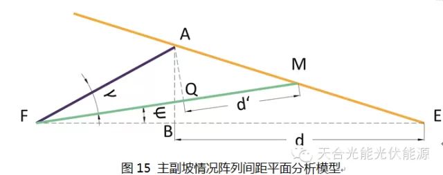 (坡面南偏东:θ为正,坡面南偏西:θ为负) 3、主副坡同时存在的情况 主副坡同时存在于东西坡面或南北坡面,这在混凝土平屋面上是比较常见的,如图13和图14,这两种情况比上述第1点和第2点还要复杂,这里分析的方法是分为两步,先分析东西向坡面,再在此基础上分析南北向坡面,比如说主坡东西向,副坡南北向,那么就可以按照下面思路去求解: 假设主坡坡角为θ,副坡坡角为Ψ。 根据上述第2点分析出来的公式,可求解出东西坡阵列前后绝对间距d,得到这个值后,进入第二步,如图15在三角形FAE中,|BE|为d,代入第1点所讲的斜面公式,可求解d’。 图15 主副坡情况阵列间距平面分析模型