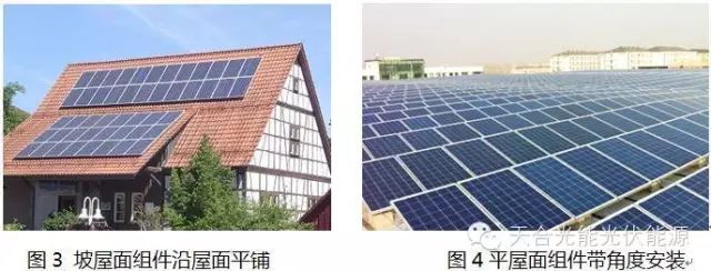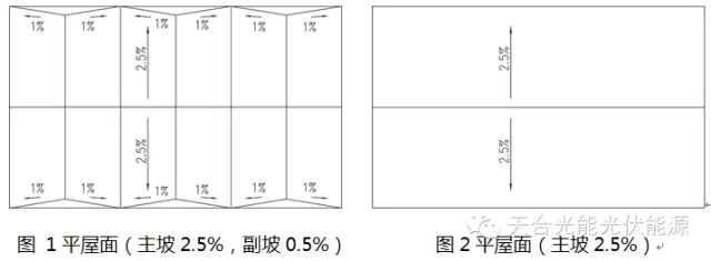 【摘要】本文基于水平面上的阵列间距计算模型,针对复杂屋面前后间距的计算问题,结合阵列安装角度、屋面坡度、坡面朝向、屋面方位角、太阳高度角、太阳方位角等影响因素,建立数学模型并推导得出理论计算公式,对于实际电站设计中遇到的含有屋面方位角的双坡屋面、主副坡屋面等复杂屋面阵列间距的设计,具有一定的指导作用。 目前分布式光伏系统的应用主要以工业、商业或民用建筑屋顶为主,光伏阵列排布在分布式系统设计中是非常重要的环节,对于阵列前后间距的优化,我们一般以冬至日上午9时和下午15时阵列前后互不遮挡的原则作为参考,它不仅要考虑当地纬度下的太阳高度角、太阳方位角、安装倾角,也还要考虑屋面本身的坡度、坡面朝向和坡面方位角,而目前对于光伏阵列前后间距的研究文献大多是正南朝向的水平屋面,虽然也有涉及到坡角和方位角,但分析仍不够全面,存在一定的局限性。因为实际的屋面可能同时呈现坡度和方位角,也有可能屋顶坡面东西朝向或主坡副坡同时存在,因此有必要对这些复杂屋面的阵列间距做深入分析。 通常情况下,屋面一般按其坡度的不同分为坡屋面(屋面排水坡度大于10%)和平屋面(屋面排水坡度小于5%)两大类。对于平屋面,一种是只有横向排水坡度(或称为主坡),没有纵向排水坡度(或称为副坡、边坡),另一种则稍复杂些,同时存在主坡和副坡,副坡和主坡形成一定的角度,两种情况参考图1和图2。主坡较常见的为2%~3%,副坡为0.5%~1%。 从光伏组件安装应用角度,目前使用最广泛的为平屋面,如工业彩钢瓦屋面、混凝土屋面,而坡屋面主要为别墅类,因坡屋面自身坡度较高,所以光伏组件一般沿着屋面平铺,参照图3。而平屋面的坡角较小,则需要设计一定的安装倾角来获得更高的发电效率,参照图4。 平屋面可分为坡角为0°角和不为0°角两种,按照坡面朝向又可以分为东西坡和南北坡屋面,如图5为东西朝向双坡面,图6为南北朝向双坡面,这两种屋面光伏阵列朝南安装在南坡或北坡。当然这两种屋面可能同时存在主坡和副坡,也可能存在一定的方位角,为计算方便起见,这里坡面的方位角定义为坡面法线方向在水平面的投影和正南方向的夹角,偏西为正,偏东为负。 平屋面可分为坡角为0°角和不为0°角两种,按照坡面朝向又可以分为东西坡和南北坡屋面,如图5为东西朝向双坡面,图6为南北朝向双坡面,这两种屋面光伏阵列朝南安装在南坡或北坡。当然这两种屋面可能同时存在主坡和副坡,也可能存在一定的方位角,为计算方便起见,这里坡面的方位角定义为坡面法线方向在水平面的投影和正南方向的夹角,偏西为正,偏东为负。 本文主要研究对象为东西坡和南北坡这两种典型的平屋面,并推广到屋面含有方位角和主副坡共存的复杂情形。目前阵列前后间距值的获得有理论计算法和软件模拟法,软件法如借助于PVSYST软件,通过对屋面和阵列的建模,输入一系列间距值以可视化的形式模拟阴影变化,再通过不断逼近优化获得符合要求的阵列间距值,其优点是可视化较强,缺点是过程较为繁琐,并且屋面复杂程度越大,软件的模拟难度也会增加,一般可作为辅助分析工具,另一种就是本文重点研究的理论计算法,从模型建立和立体几何上的三角关系入手探索阵列间距和其影响因素之间的本质关系。 在分析上述两种屋面阵列前后间距之前需要先回到水平屋面模型上来,如图7为水平面阵列间距的计算模型,相关参数已在图中标注,具体可参考相关文献。在这里我将三棱锥BCDA和三角形AFE称为水平面上的前后间距计算基础模型,这两个模型非常有用,是复杂坡屋面分析的基础。其中面BCD为水平面,A点为组件的最高点,若组件为纵向安装,则最高点在长边框上,若组件横向安装,则最高点在短边框上,这里以纵向安装为例进行分析。B为A点在水平面上的正投影,太阳光线经过A点与水平面交与D点。BD为AD在水平面上的正投影,CD为BD在正南方向的正投影,太阳高度角∠α=∠BDA,太阳方位角∠β=∠BDC,阵列前后的绝对间距为d,那么d可以表示为: 图7水平面上阵列间距计算经典模型 在水平面阵列间距计算经典模型的基础上,下文依次对上述两种典型坡向的平屋面进行详细分析,第一种是南北坡面,第二种为东西坡面,然后再推广到含有坡面方位角变量的通解公式。 1、平屋面南北坡向(坡面方位角为0°),坡角θ不为0° 示意图参考上文图5,这里以南坡为例进行分析。这里分析的方法是将光线和前后阵列组件作南北向的投影,如图8所示。假设某一时刻太阳的方位角为β,高度角为α,组件与屋面夹角γ,屋面坡角θ,光线经过组件的最高点A,与假想水平面相交于E点,与屋面相交于M点。B为组件最高点在水平面的正投影,AQ⊥屋面,|QM|为需要求解的阵列前后的绝对间距d,|FM|为阵列前后的间距(或称中心距),|FQ|为组件在屋面上的投影距离,则可将问题转化到△FAE和△AQM中求解,那么阵列前后间距则为:|FM|=|FQ|+|QM|。 图8南坡斜屋面阵列前后间距模型(立面图) 假设组件长度|AF|=l1,△AFE中,根据水平面基础模型可知,|BE|=