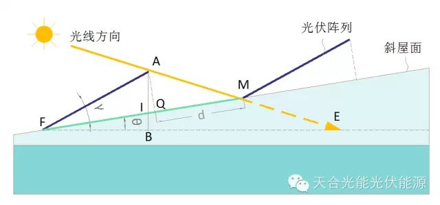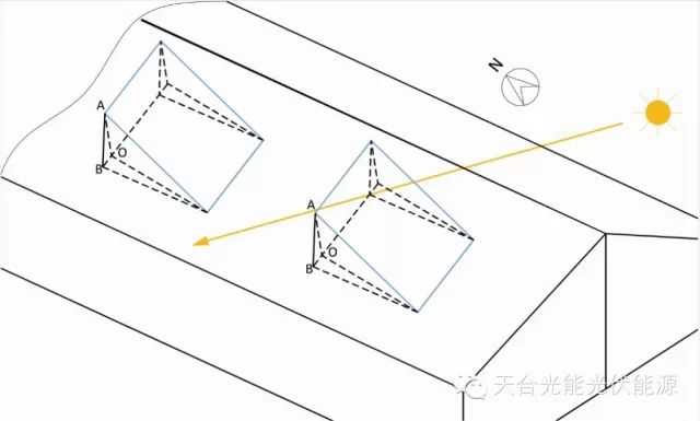 (适用条件:屋面正南朝向,当屋面倾角向下θ为负,倾角向上θ为正),对于冬至日,阵列间距一般性以上午9点或下午15点的太阳位置进行计算。 【推广公式】坡面非南北朝向(坡面方位角Ƹ不为0°),坡角θ不为0° 上面推导是假设屋面方位角为0°时的情况,实际屋面方位角可能往南偏东或偏西方向。如果是水平屋面,若方位角发生偏移,组件排布仍可以选择正南朝向安装,也可以和屋面方位角保持一致,具体需要视方位角大小对发电量的影响程度而定,但是斜屋面坡面不同,若方位发生偏移,则组件阵列需要同时跟着偏移。 因此如果建筑物坡面有一定的方位角Ƹ,假如南偏西Ƹ,对于冬至日,则需要使用15: 00 的太阳方位角计算,若坡面方位角为南偏东Ƹ,则用9: 00 的太阳方位角计算,所以阵列前后间距计算需要的实际方位角大小应为: