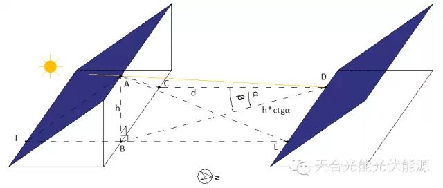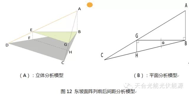 (以水平面作基准面,当屋面坡角向下θ为负,向上θ为正)。 2、坡面东西朝向(坡面方位角Ƹ=±90°),坡角θ不为0° 参考图10和图11,这里先以东坡面(坡面方位角Ƹ=-90°)为例进行分析,组件阵列安装在东坡面,阵列方位角正向朝南,B为组件最高点A的重心线与屋面的交点,O为A在屋面上的垂足,屋面的坡角为θ,则∠BAO也为θ。在图12中,△BEG为假想水平面,棱锥ABEG构成了刚才提到的基础模型,其中BE为太阳光线在△BEG平面上的投影,EG为正南方向的线段,∠AEB为太阳高度角,∠BEG为太阳方位角,阵列与屋面夹角γ,组件长度l1。光线过E与屋面交于D,作AG的延长线交于屋面于C,则DC长度为我们需要求解的阵列前后绝对间距d。 图10 东西坡阵列前后间距分析示意图 图11东西坡阵列前后间距分析(南立面图) 根据图10和图11三角关系得 在图12中,根据水平面基础模型,可得