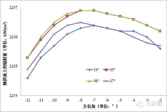 我国在北半球,大家在进行固定式光伏阵列方位角选择的时候,几乎都会选择正南,即方位角为0°。那方位角不为0°时,发电量会如何变化?如果偏向东,那早上的发电量就会提高;如果偏向西,那傍晚的发电量就会提高;单轴跟踪就是利用这一点,通过提高早晚的发电量而使整体发电量提高的。 甘肃武威光伏电站实测发电量情况如下图。 那是不是在某些地方?固定式光伏阵列的方位角不为0°,发电量也许更大?与青海的金总多次讨论固定式光伏阵列的方位角问题,近来有时间,就找了几个点,用现有的软件做了大量的试算。 结果发现:用PVSystem进行计算,在某些地方,方位角不为0°时,倾斜面上的辐射量也许更大,即发电量会更大。 先用3个点的实际数据来说明问题。 表1 3个点的参数 点1的计算结果: 图2 点1在倾角为33°~36°、方位角为-10°~10°时倾斜面上的辐射量 图3 点1在倾角为33°~36°、方位角为-5°~5°时倾斜面上的辐射量 点2的计算结果: 图4点2 在倾角为34°~37°、方位角为-14°~3°时倾斜面上的辐射量 点3的计算结果: 图6点3 在倾角为33°~37°、方位角为-10°~10°时倾斜面上的辐射量 图7点3 在倾角为34°~37°、方位角为-12°~-2°时倾斜面上的辐射量 仅从上面三组图看出(不一定有广泛的推广意义): 1)最佳方位角不一定为0°。点1为0°,点2为-7°,点3为3°。 2)无论方位角是多少,最佳倾角是不变的。 3)方位角分别为0°和最佳方位角时,倾斜面上的辐射量差异不大,点2为0.063%,点3为0.028%。如果0°时当地的满发小时数位1500h,则最佳方位角时,满发小时数会增加1h和0.4h;一个50MWp的光伏电站,年收入会减少5万元和2万元(按1元/kWh)考虑。 4)光伏阵列方位角不为0°时,发电量的减少并没有想象的那么大。 下表统计了3处点在方位角不为0°时的发电量损失。 因此,在一些山地项目中,如果顺山势铺设可以减少可观的投资,不妨损失一点发电量。 |