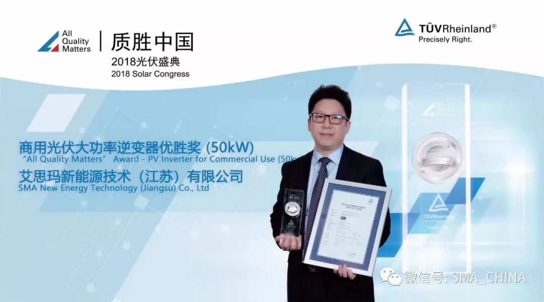 3月22日,由德国莱茵TÜV主办的2018“质胜中国”光伏盛典”在江苏无锡隆重召开。一年一度的德国莱茵TÜV“质胜中国优胜奖”(简称:质胜奖),凭借其客观可信的评定流程、权威中立的评选机构,已成为光伏组件、逆变器、储能系统、零部件等最高竞技舞台。本届典礼吸引来自全球光伏行业的专家学者、企业代表等汇聚一堂,聚焦亚太以及全球经济背景下大中华地区的光伏革命,通过行业嘉宾互动讨论、最佳案例分享等为产业的蓬勃发展出谋划策。 SMA受邀出席2018“质胜中国”光伏盛典”,凭借SMA SOLID-Q PRO 60产品的卓越品质与超高能效,在“质胜中国优胜奖”50kW以上功率逆变器测试评比中斩获第一,荣获2017年度“质胜中国商用光伏大功率逆变器优胜奖”。SMA中国总裁张勇博士上台领奖,并接受EnergyTrend媒体专访。 SMA中国产品开发副总裁廖小俊也应邀参加了本次盛会,针对获奖的SMA SOLID-Q PRO 60光伏逆变器产品与现场嘉宾进行了深入的技术交流。 SMA SOLID-Q 50 / PRO 60 SMA SOLID-Q系列光伏逆变器将德国品质和中国智造完美结合,致力于高可靠性和卓越的性价比体验。SOLID-Q 50可灵活应用于商业屋顶、光伏扶贫等通过低压并网的中小型分布式电站。SOLID-Q PRO 60得益于更高的电压输出和无N线设计,可广泛应用于大型屋顶、山地丘陵、农光互补等通过中高压并网的MW级大中型分布式和地面电站,显著降低安装和维护成本,提高投资收益。 |