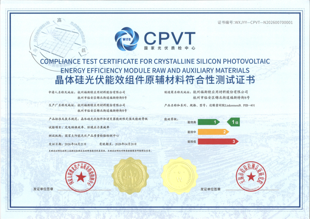 2026年4月21日至4月22日,在宁夏银川召开的中国光伏行业协会光伏辅材及零部件产品专委会二届一次会议&光伏产品质量提升技术研讨会,福斯特(17.790, -0.36, -1.98%)自主研发的Linkermen®丁基胶产品凭借卓越的可靠性能,荣获国家太阳能(5.330, -0.36, -6.33%)光伏产品质量检验检测中心(CPVT)首张光伏行业能效符合性测试证书 - 1级能效证书。 ![]() Linkermen®丁基胶产品具备优异绝缘性能、高阻隔性以及稳定的粘结性,与封装胶膜、边框胶材料具有良好兼容性。福斯特丁基胶产品始于2015年,经过十余年的技术创新和产品迭代,作为HJT、钙钛矿、薄膜电池等高效组件边缘阻隔密封材料实现批量规模化应用,是首个获得头部组件公司大批量应用的国产丁基胶品牌。同时,基于Linkermen®丁基胶产品的长期稳定绝缘性能,其作为有效绝缘结构材料应用于TOPCon、XBC组件的电池片扩片、多分片等高效技术方案中,为1500V、2000V系统电压的下一代高效组件提供了高可靠性边缘密封绝缘解决方案。 国家太阳能光伏产品质量检验检测中心(CPVT)是我国光伏领域最具权威性的国家级法定检验机构之一,承担着光伏产品质量监督、检测认证、标准制定等核心职能。此次认证严格依据《晶体硅光伏组件和逆变器能效限定值及能效等级》技术规范,重点围绕光电转换效率与环境应力衰减率两大核心指标展开评测。福斯特Linkermen®丁基胶产品在各项测试中表现优异,最终斩获最高评级——1级能效。作为国家级权威机构颁发的首张丁基胶产品证书,标志着福斯特边缘密封材料产品达到能效等级行业领先水平,也为行业树立边缘密封材料技术和质量管控的新标杆。 |