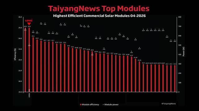 近日,全球权威光伏媒体TaiyangNews正式发布2026年4月版全球量产组件效率榜单(TOP SOLAR MODULES Listing),隆基绿能基于HIBC(高低温复合钝化背接触)技术打造的EcoLife系列组件以25%的量产效率荣登榜首,标志着隆基的BC技术实力再获国际认可,全面引领光伏组件效率迈入“25%+”新时代。