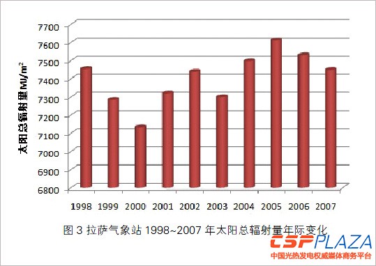 图3 拉萨气象站1998~2007年太阳总辐射量年际变化 |